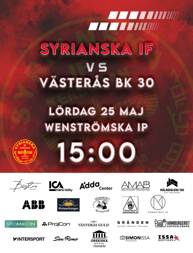 Efter förra helgens förlust där Västerås FC gick segrande ur drabbningen med 3-1 sedan rödgult åkt på ett synnerligen tveksamt rött kort tidigt i matchen. Trots detta lyckades Syrianska kvittera innan siffrorna rann iväg till slutresultatet 3-1. Rödgult har åkt på sin första förlust för i år och har i helgen chans till revansch när det vankas lokalderby. Västerås BK 30 kommer på besök. Syrianska har efter helgens omgång inkasserat 10 poäng på fem matcher och parkerar därmed på en fjärdeplats i tabellen, två poäng bakom serieledande IFK Västerås. BK 30 har spelat in 1 poäng på de första fem matcherna och är jumbo i tabellen. Alla vet vad som väntar när det spelas derbymatcher och här finns inte plats för underskattning. Gör rödgult jobbet fullt ut så ska de tre poängen spelas in, men det ska spelas 90 tuffa minuter innan dess. Våra ungdomslag spelar massvis med matcher i helgen. Se till att stötta dem på plats. Lördag 25 maj Syrianska IF F10 - Västerås SK 10:00 (borta) Syrianska IF F10 - Sala FF 12:00 (hemma) Syrianska IF P11/12 - Surahammars FK 12:15 (hemma) Syrianska IF P14/15 - Irsta IF 12:30 (borta) Syrianska IF P14/15 - Irsta IF 14:00 (borta) Syrianska IF A-lag - Västerås BK 30 15:00 (hemma) Söndag 26 maj Syrianska IF F13/14 - Dingtuna GIF 14:30 (borta)